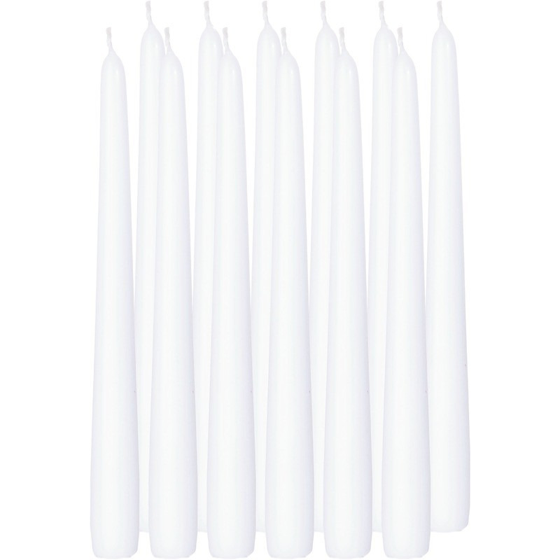 Formaat per stuk: diameter 2,3 cm, hoogte 25 cm. Aantal branduren per stuk: 8 uur. Materiaal: wax/was, paraffine. Kleur: wit.