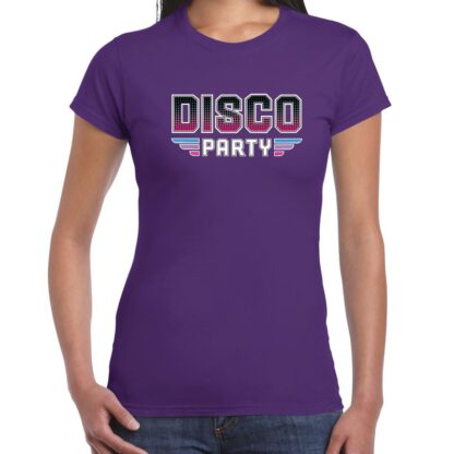 Disco party feest t-shirt paars voor dames. Op dit paarse shirt staat de tekst: Disco Party, in discostijl. Het shirt, met disco effect, is leuk om bijvoorbeeld kado te doen of om te dragen tijdens een 70s (seventies), 80s (eighties) of 90s (nineties) disco feest. Materiaal: 150 grams, 100% katoen. Let op: dit artikel valt klein, we adviseren om 1 maat groter te bestellen.