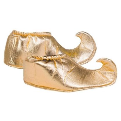 Gouden 1001 nacht schoenovertrekken voor kinderen. Goudkleurige schoenenovertrekken/cover met een lengte van ongeveer 27 cm. Leuk voor bij je Arabische/1001 nacht thema outfit! Sprookjes schoenen verkleed accessoire voor jongens/meisjes.
