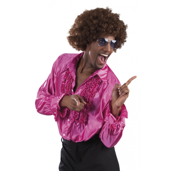 Voordelige fuchsia rouche blouse voor heren. Party overhemd met rouches. Materiaal: polyester.
